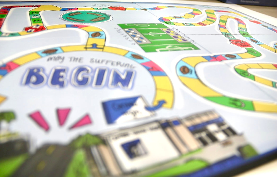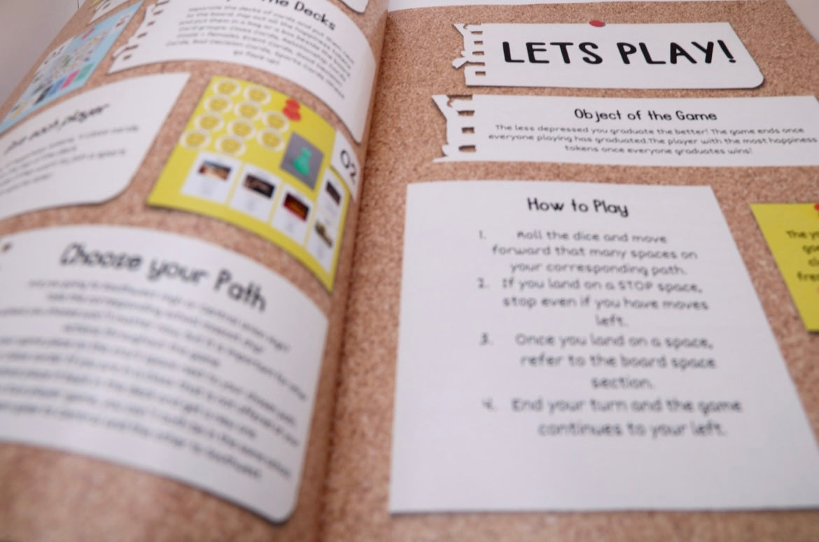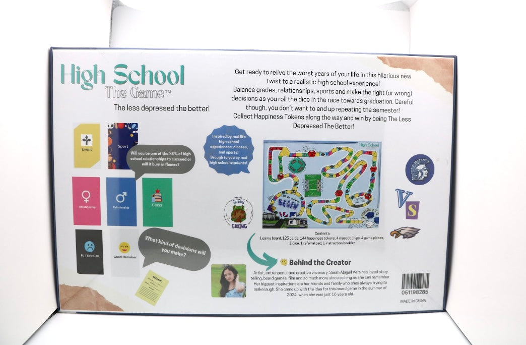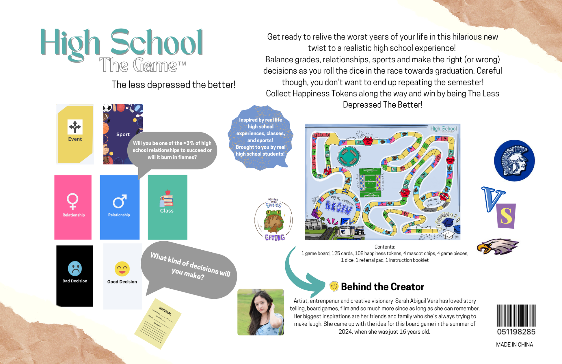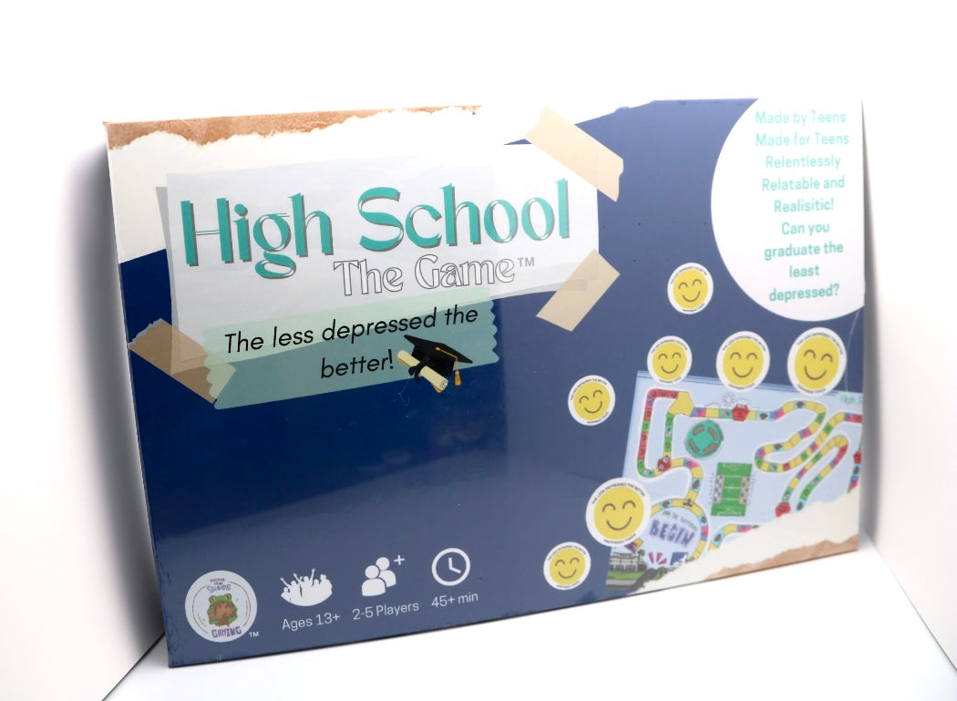 High School The Game is a game that ventures through the journey of high school and all the ups and downs that come along with it. Players experience events, decision making, relationships, classes and high school rivalry that all affect their happiness. Happiness is measured in what is called “happiness tokens.” The game is won by collecting the most happiness tokens by graduation. The happier, or should I say, the less depressed—the better!